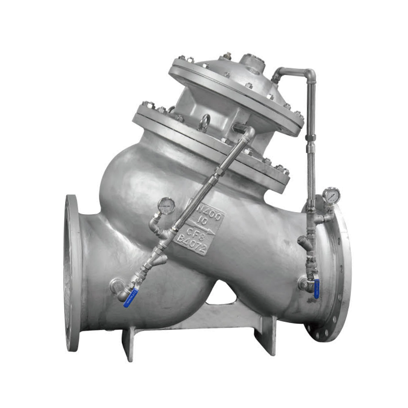 3、消除水錘和噪音:水泵停止運行時,主閥分兩級關(guān)閉,主閥瓣先快速關(guān)90%,小閥瓣再緩慢關(guān)閉(關(guān)閉速度可根據(jù)現(xiàn)場工況進行調(diào)節(jié)),從而消除了水錘和噪音。
