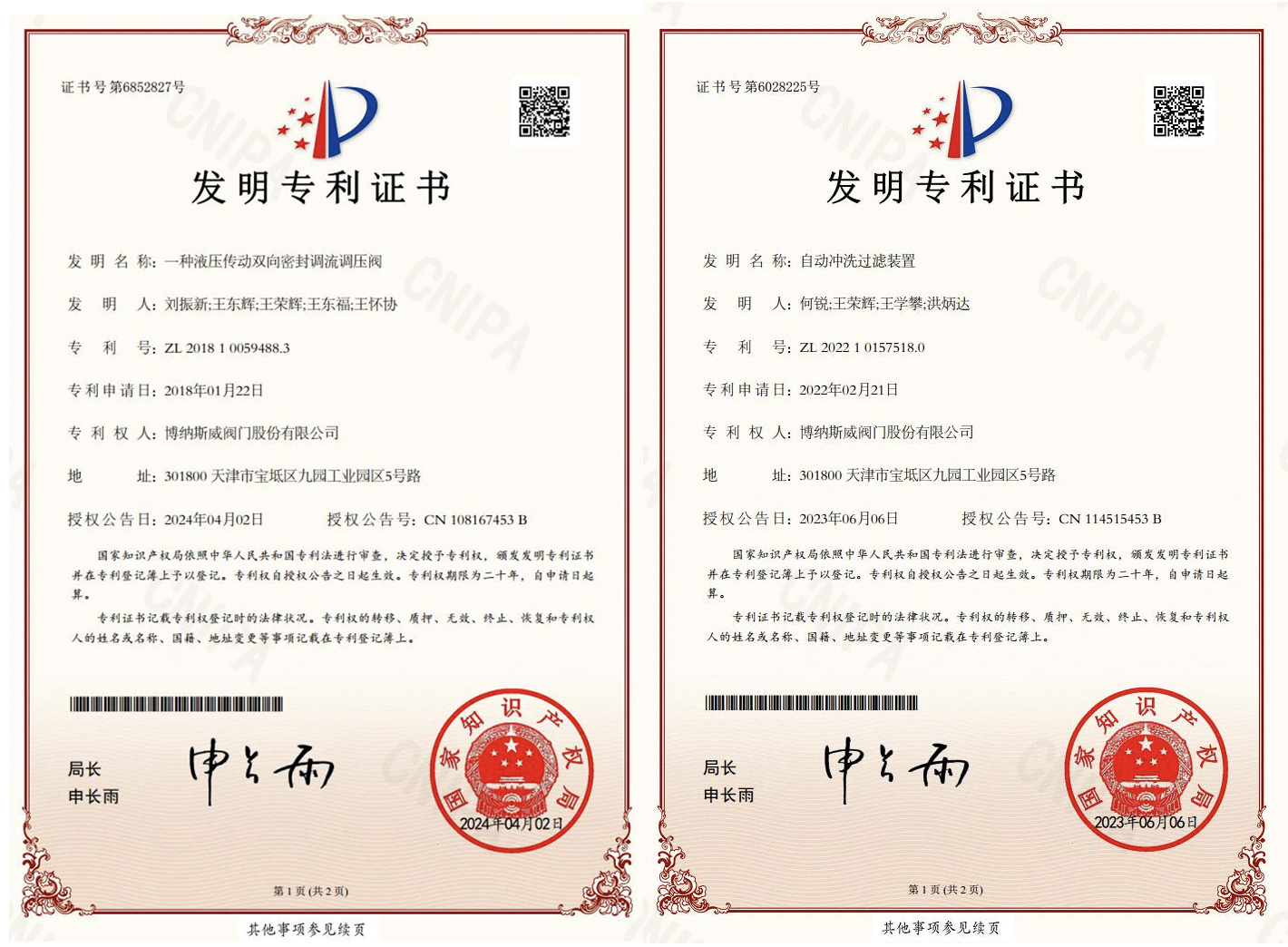 博納斯威閥門股份有限公司持續創新,近期,自動沖洗過濾裝置、軸流式雙級雙向調節閥、閥桿水平驅動式偏心半球閥、對沖消能軸流式角旋閥、一種帶有內置阻尼裝置的消聲緩閉止回閥、一種防水錘蝶閥、一種輸入端帶有非同步鎖定機構的驅動裝置、一種液壓傳動雙向密封調流調壓閥等八項新技術,先后獲得國家知識產權局授權發明專利!迄今為止,博納斯威獲得專利總數量達到276項,其中發明專利27項,實用新型185項,外觀專利64項。
