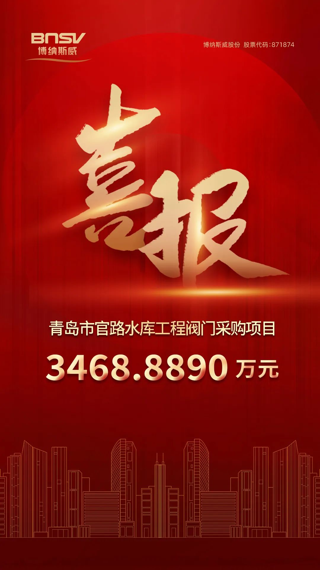 喜報!博納斯威中標青島市官路水庫工程閥門采購項目3468.8890萬元